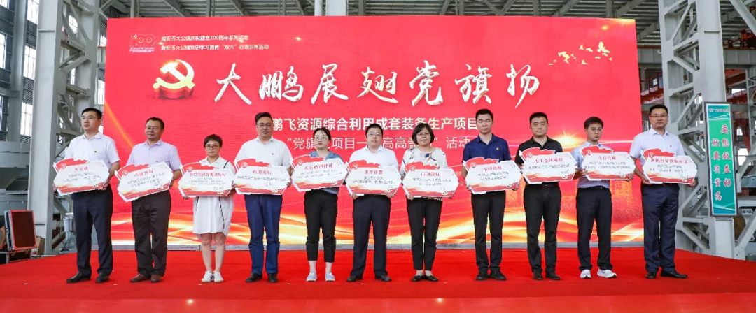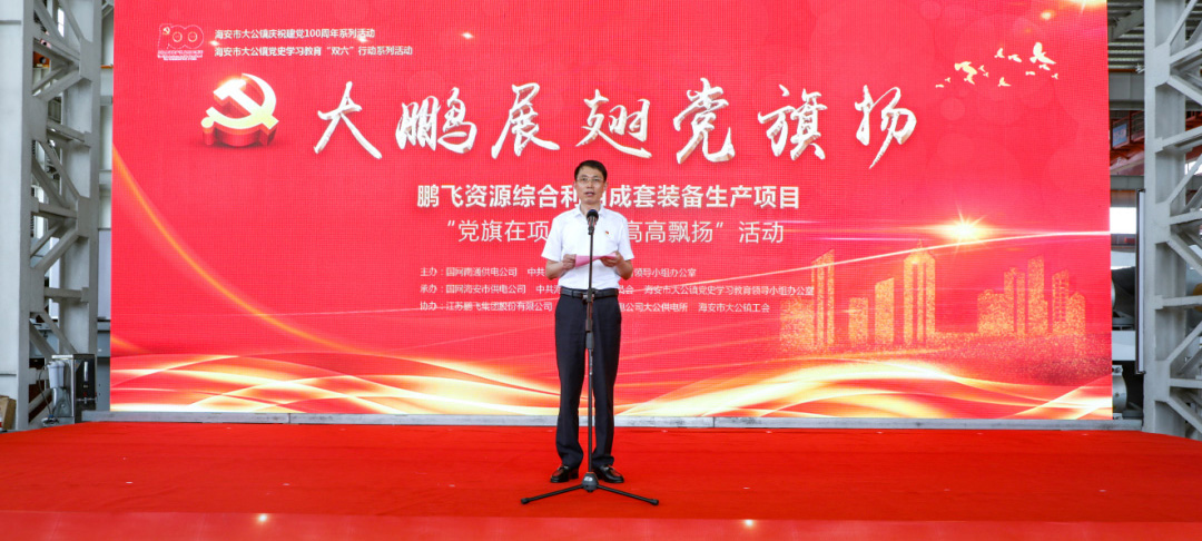 “今天活動(dòng)現(xiàn)場(chǎng)的‘鵬飛資源綜合利用成套裝備生產(chǎn)項(xiàng)目’是2021年江蘇省重大項(xiàng)目,南通市‘黨旗在項(xiàng)目一線高高飄揚(yáng)’活動(dòng)第一批啟動(dòng)項(xiàng)目。為了著力提升服務(wù)效能,健全重大項(xiàng)目服務(wù)機(jī)制,大公鎮(zhèn)牽頭組織成立項(xiàng)目臨時(shí)黨支部、項(xiàng)目服務(wù)專班,一刻不停推項(xiàng)目,讓黨旗飄揚(yáng)在項(xiàng)目一線;一著不讓抓發(fā)展,讓黨員沖鋒在項(xiàng)目一線;一以貫之優(yōu)環(huán)境,讓服務(wù)下沉到項(xiàng)目一線,著力辦實(shí)事、解難題,為推進(jìn)重大項(xiàng)目建設(shè)提供有力支撐和堅(jiān)實(shí)保障。”大公鎮(zhèn)黨委書記金山存說(shuō)。