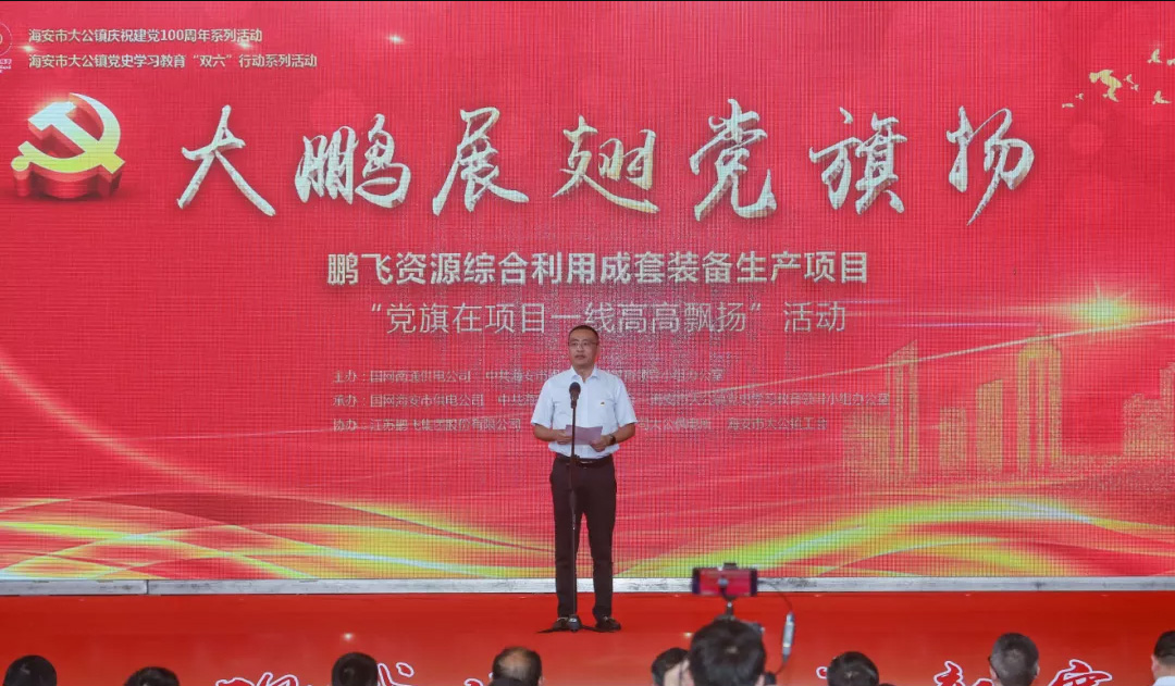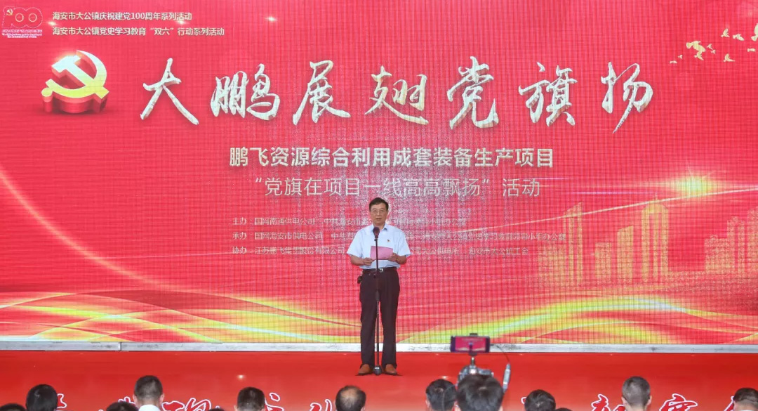 鵬飛資源綜合利用成套裝備生產(chǎn)項(xiàng)目是南通市第一批“黨旗在項(xiàng)目一線高高飄揚(yáng)”啟動(dòng)項(xiàng)目,由國(guó)網(wǎng)南通供電公司掛鉤聯(lián)系。“國(guó)網(wǎng)南通供電公司黨委把開(kāi)展黨史學(xué)習(xí)教育作為一項(xiàng)重大政治任務(wù),發(fā)揮優(yōu)勢(shì)、凸顯特色,推動(dòng)黨史學(xué)習(xí)教育與項(xiàng)目建設(shè)、服務(wù)企業(yè)辦實(shí)事等重點(diǎn)工作深度融合,做到建強(qiáng)堡壘,黨旗飄在項(xiàng)目一線;舉旗亮徽,黨員沖在項(xiàng)目一線設(shè)崗定責(zé),服務(wù)下沉項(xiàng)目一線。”國(guó)網(wǎng)南通供電公司副總經(jīng)理李秋實(shí)介紹如何國(guó)網(wǎng)公司將服務(wù)下沉項(xiàng)目一線時(shí)說(shuō)道。