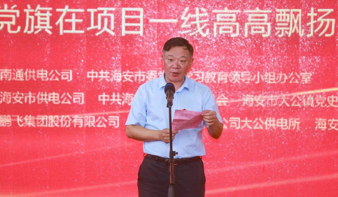 國(guó)網(wǎng)南通供電公司副總經(jīng)理李秋實(shí),海安市委常委、宣傳部部長(zhǎng)王榮貴,海安市委組織部副部長(zhǎng)、“兩新”工委書記吳蘭,海安市委宣傳部常務(wù)副部長(zhǎng)劉萬(wàn)春,海安市委宣傳部副部長(zhǎng)、新聞出版局局長(zhǎng)陳琳,國(guó)網(wǎng)海安市供電公司總經(jīng)理唐玉婷,海安市發(fā)改委黨組成員、工信局專職副局長(zhǎng)陳皞,鵬飛集團(tuán)黨委書記、董事長(zhǎng)王家安,大公鎮(zhèn)黨委書記金山存,大公鎮(zhèn)黨委副書記、鎮(zhèn)長(zhǎng)魯競(jìng)共同啟動(dòng)“黨旗在項(xiàng)目一線高高飄揚(yáng)”活動(dòng)。