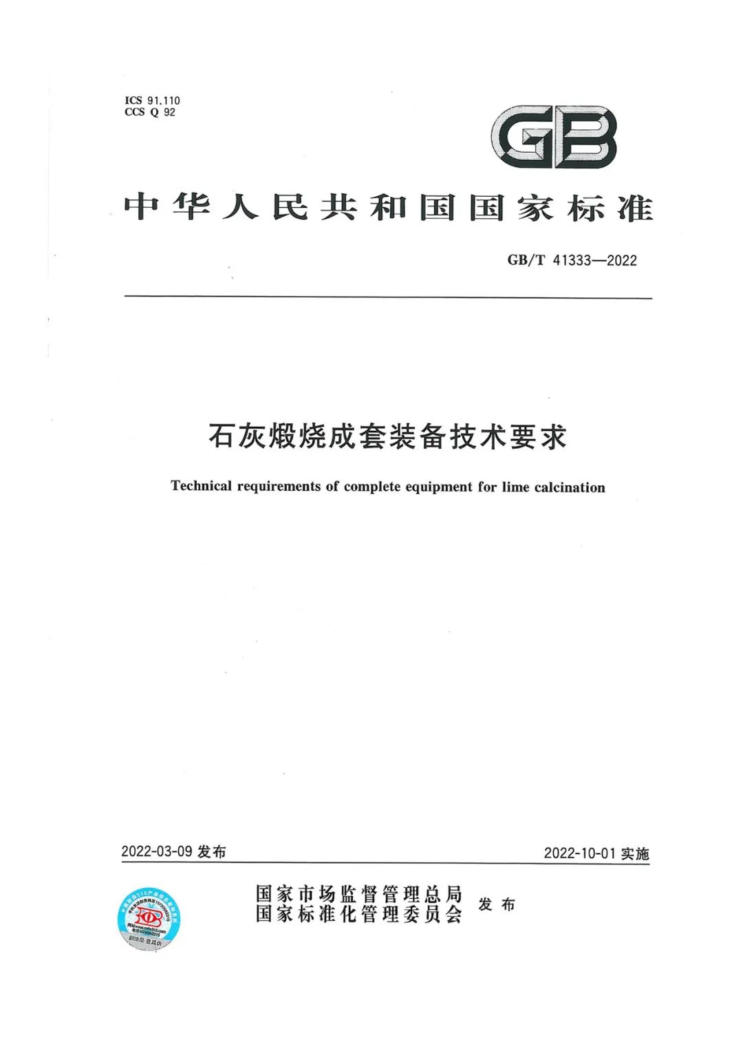 石灰行業(yè)《石灰煅燒成套裝備技術(shù)要求》(GB/T 41333-2022)最新標(biāo)準(zhǔn)于2022年3月9日正式發(fā)布,并將于2022年10月1日起實(shí)施。