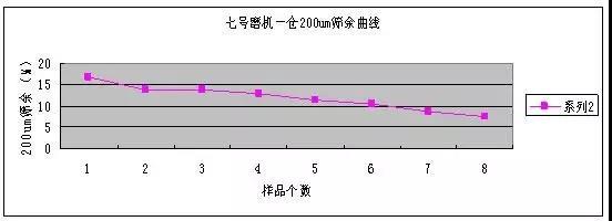 (1)從以上的兩個(gè)趨勢(shì)圖可以看出七號(hào)磨機(jī)的一倉(cāng)粉磨能力還可以,特別是200um的篩余趨勢(shì)圖,篩余下降明顯。說明一倉(cāng)鋼球級(jí)配和理粉磨能力正常。