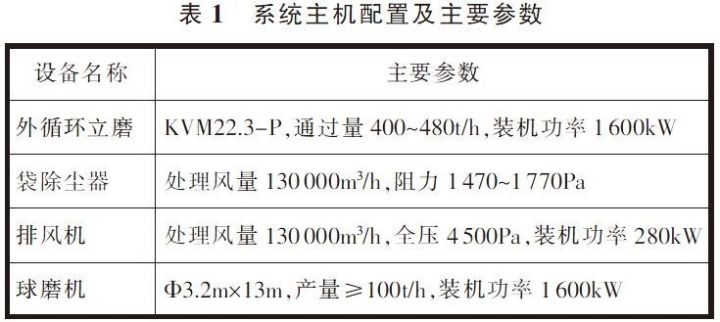 改造后的系統(tǒng)主機配置及主要參數(shù)見表1,系統(tǒng)工藝流程見圖1。該系統(tǒng)與其他立磨組成的聯(lián)合粉磨系統(tǒng)相比,主要在于立磨本身的高效粉磨特殊設計,另外,選粉系統(tǒng)采取高料氣比設計與操作(實際操作中V型選粉機的料氣比達5.5m3/h),實現(xiàn)選粉系統(tǒng)的最大節(jié)能化,并控制合理的入球磨機物料粒度(確保最大顆粒小于1mm),并根據(jù)入磨物料的粒度分布對球磨機進行技術改造,達到系統(tǒng)提產降耗的目的。