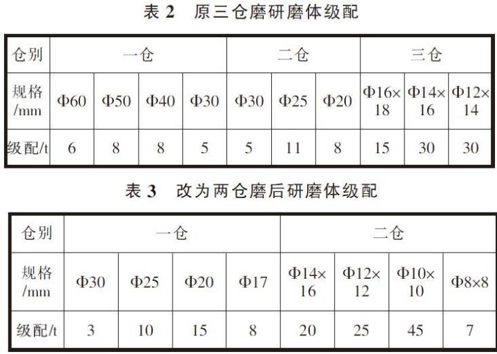 在球磨機前設置立磨預粉磨系統(tǒng)后,對球磨機進行相應的改造:將三倉磨改為兩倉磨,一倉長度改為3.25m,剩余為二倉。原二倉與三倉之間的隔倉板去掉,一倉與二倉之間的隔倉板改為雙層隔倉板,中間篩網縫隙設置為2mm,將隔倉板進料端的篦縫由20mm改為8mm左右。調整研磨體級配,調整前后的研磨體級配見表2和表3,總裝載量由126t增加到133t。將原二倉的小階梯襯板移到一倉,原三倉的波紋襯板用于二倉(二倉不夠的波紋襯板補充采購)。