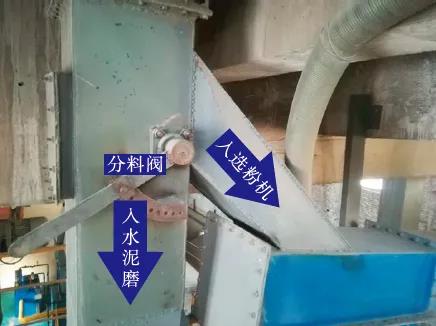 2 粉磨流程改進(jìn)我們在出V型選粉機(jī)與入磨溜子之間安裝可調(diào)節(jié)翻板式分料閥(以下簡稱分料閥),該分料閥可將物料分為兩路,一路入磨機(jī),另一路經(jīng)空氣輸送斜槽入高效選粉機(jī),同時,該分料閥還可進(jìn)行10格調(diào)節(jié)(0%~100%)。試驗前后工藝流程簡圖及照片分別見圖1~圖3。