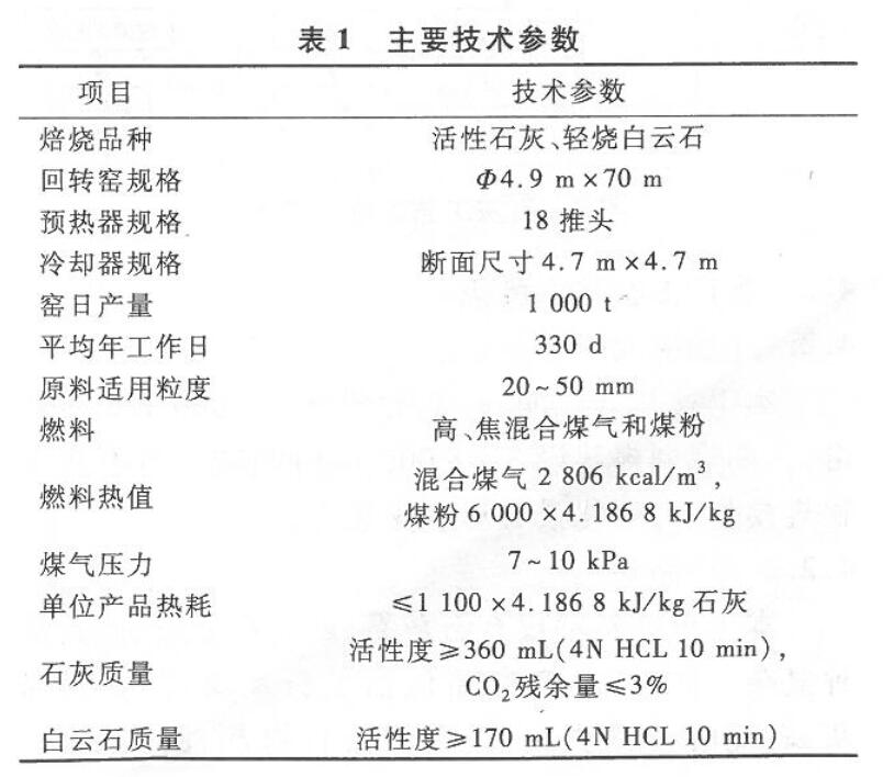 石灰石/白云石進人預熱器后經窯尾約1100 ℃的煙氣預熱,其中一部分石灰石/白云石在預熱器中分解。預熱的物料由液壓推桿推出,經轉運溜槽進入回轉窯中,物料在回轉窯內經過焙燒分解,焙燒好的石灰/白云石進入豎式冷卻器,由底部送入的冷空氣冷卻后通過振動給料機排至集料斗,再經成品鏈斗機送往成品系統(tǒng)。冷空氣在冷卻器內冷卻物料的同時被加熱,經窯頭罩進入窯內,作為燃料燃燒的二次空氣參與燃燒?;剞D窯所用燃料經由煤氣和煤粉管道分別送至回轉窯窯頭廠房,通過燒嘴從窯頭進入回轉窯內燃燒。燃料燃燒產生的熱煙氣在焙燒和加熱物料后與物料分解產生的廢氣一起從窯尾排出,經轉運溜槽進入預熱器中預熱石灰石/白云石。預熱石灰石/白云石后的煙氣從預熱器排出,經過除塵器除塵后由排煙機排入大氣。主要技術參數(shù)列于表1。