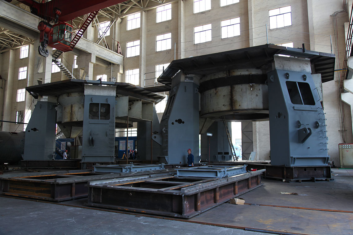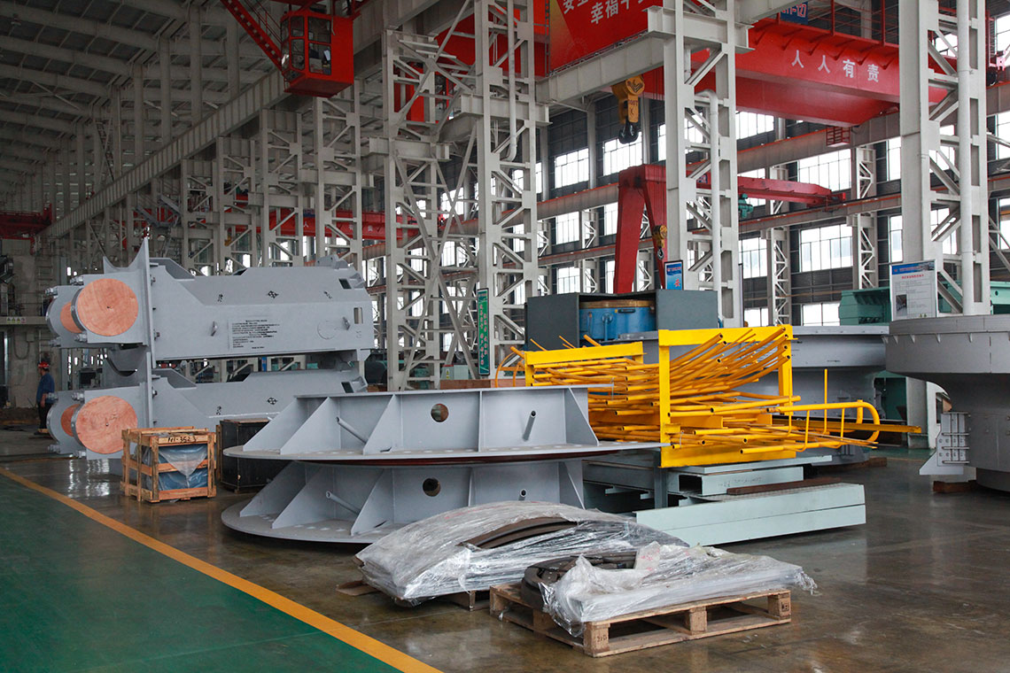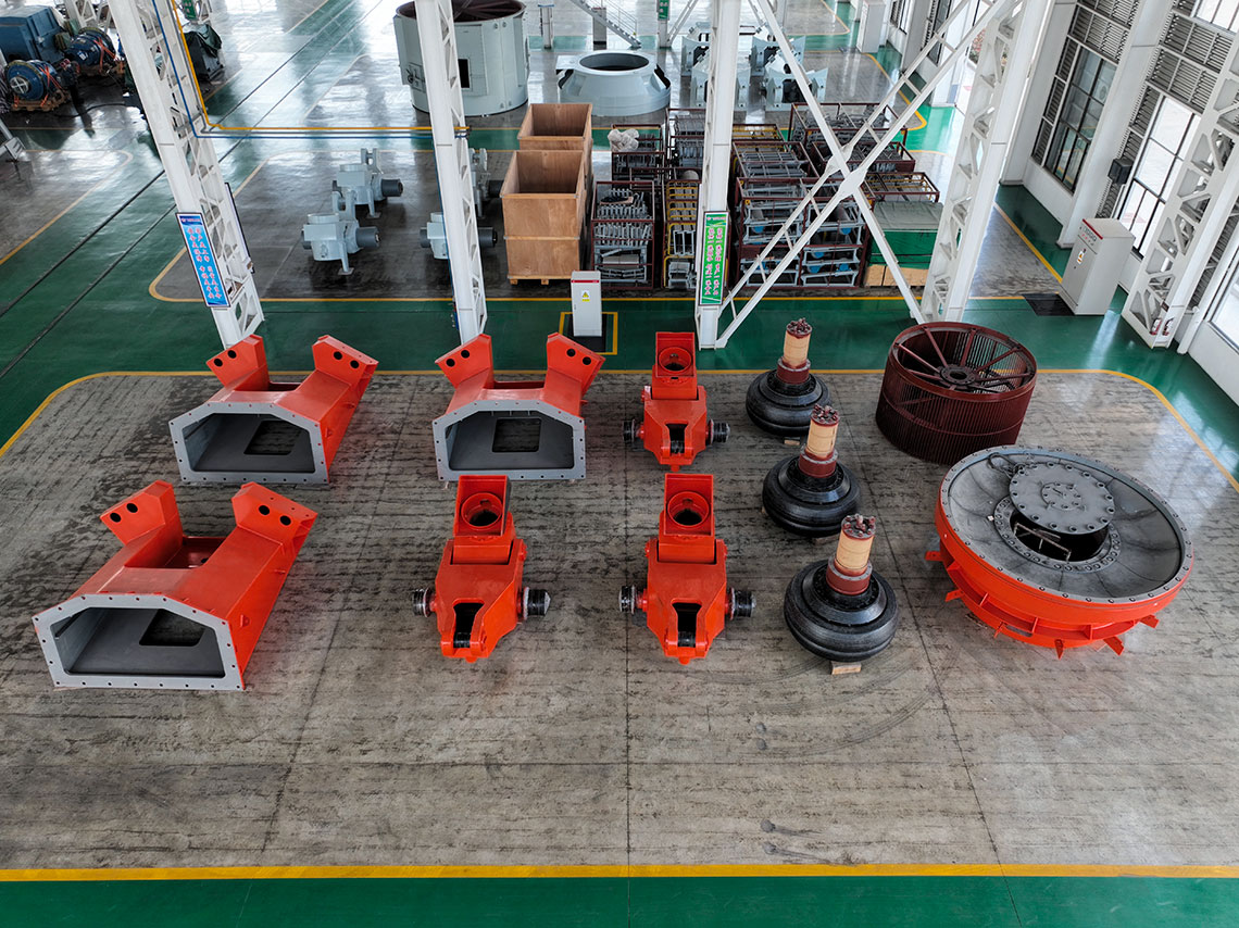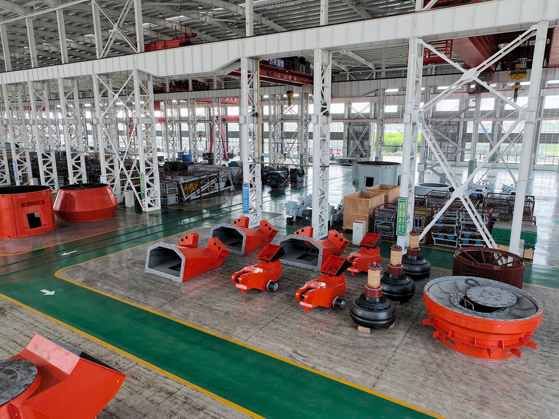 磨煤機三個磨輥由旋轉(zhuǎn)的磨盤帶動進行碾磨作業(yè)。入磨物料經(jīng)中心落煤管落在磨盤上后,由旋轉(zhuǎn)磨盤產(chǎn)生的離心力將其輸送至碾磨輥道上碾磨。碾磨壓力由彈簧或液壓加壓裝置產(chǎn)生,通過靜定的三點系統(tǒng),碾磨力均勻地傳至三個磨輥,通過加壓系統(tǒng)壓力傳至基礎(chǔ)。煤粉的干燥和輸送利用熱風(fēng)來進行。熱風(fēng)通過噴嘴環(huán)均勻分布于磨盤四周,將經(jīng)碾磨的物料干燥并輸送至磨機上部的分離器。物料的粗細粉在此分離,細粉排出磨機,粗粉重新返回磨內(nèi)碾磨。物料中的一些不可破碎物可通過磨機下部的排碴口排出。磨煤機主要由基礎(chǔ)部,減速機,下架機,中架機,磨盤,磨輥,加壓裝置,分離器,正壓風(fēng)密封裝置,蒸汽吹掃裝置等部件組成,還配有主電動機,潤滑油站,液壓站和密封風(fēng)機等附屬設(shè)備,另備有慢速傳動裝置,安裝檢修專用工具,扶梯平臺,煤粉分配器,速斷閥等配套設(shè)備供用戶選用。磨煤機采用液壓加壓系統(tǒng),在運行中即可對粉磨壓力進行調(diào)整,并具有更好的過鐵保護性能。在原標準型的基礎(chǔ)上增加了磨輥翻出裝置,并提高了磨體的抗爆能力。