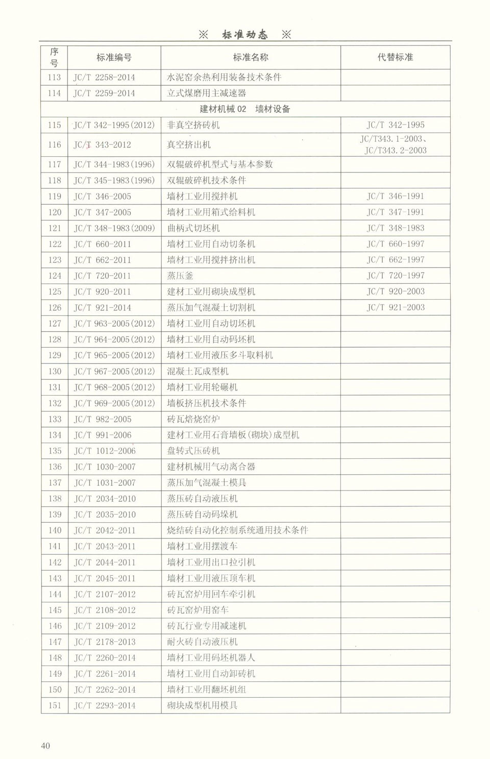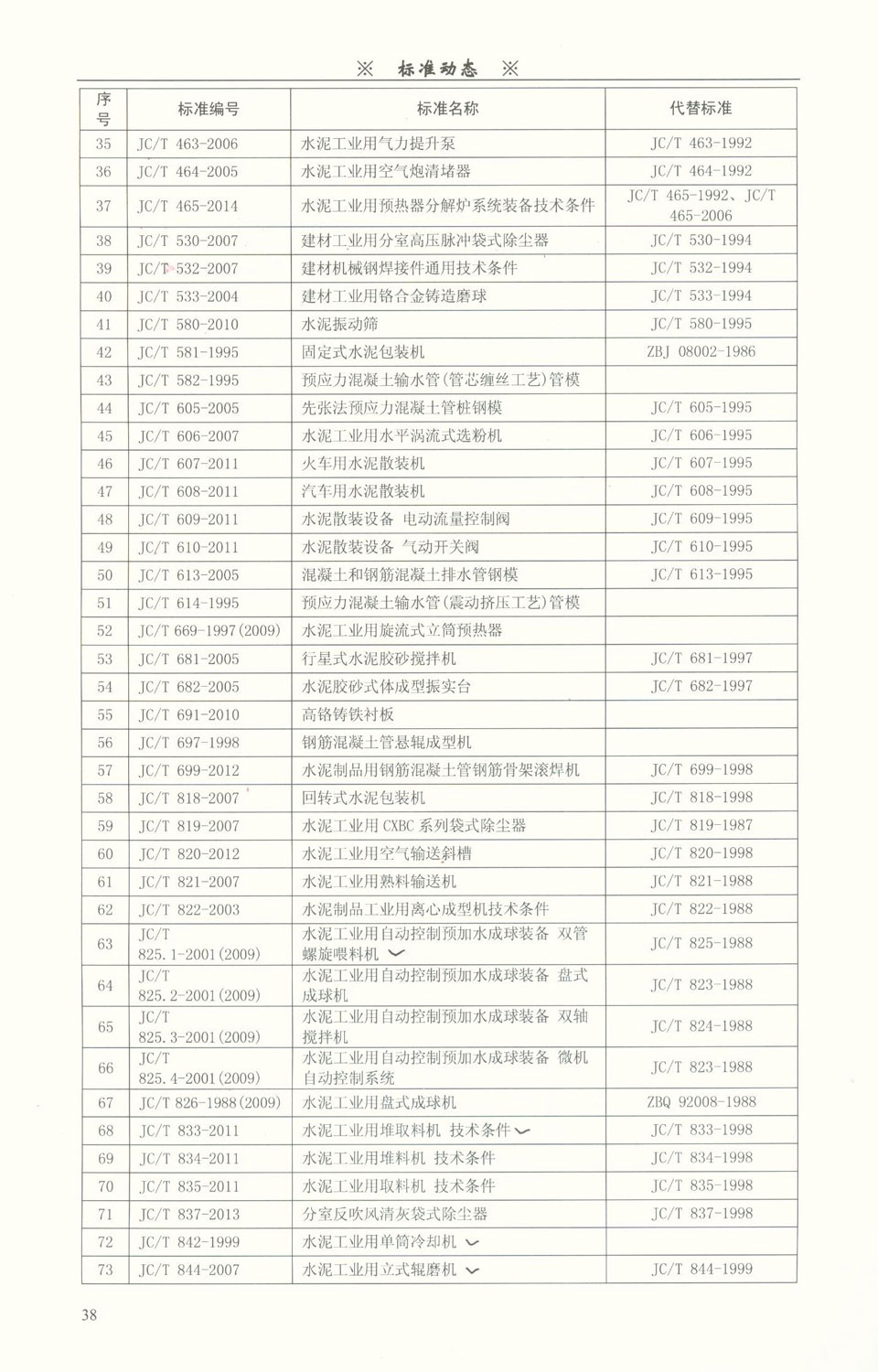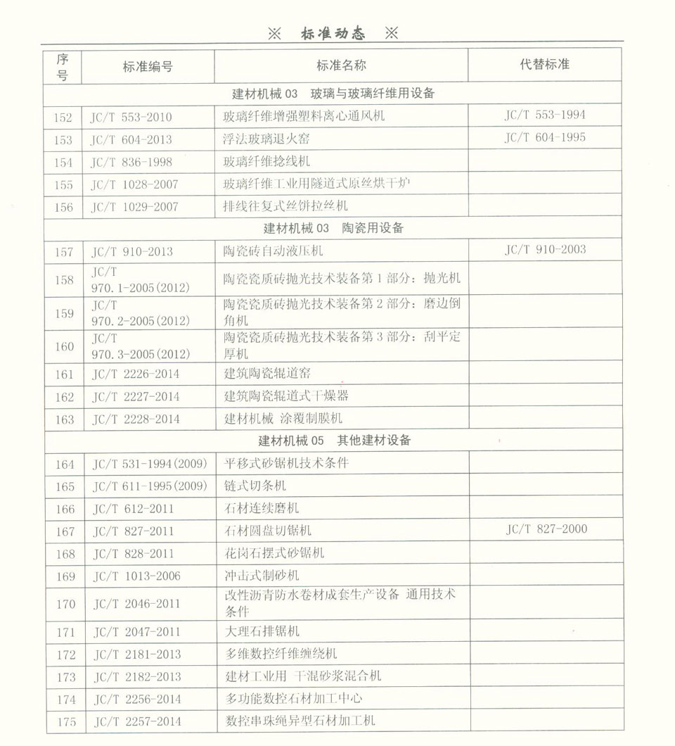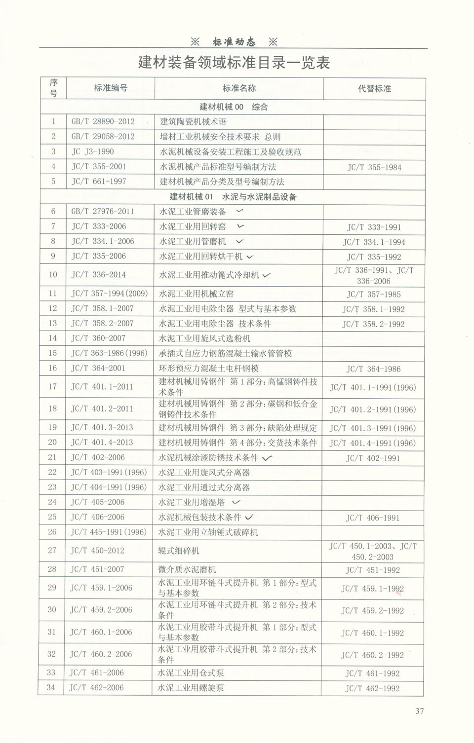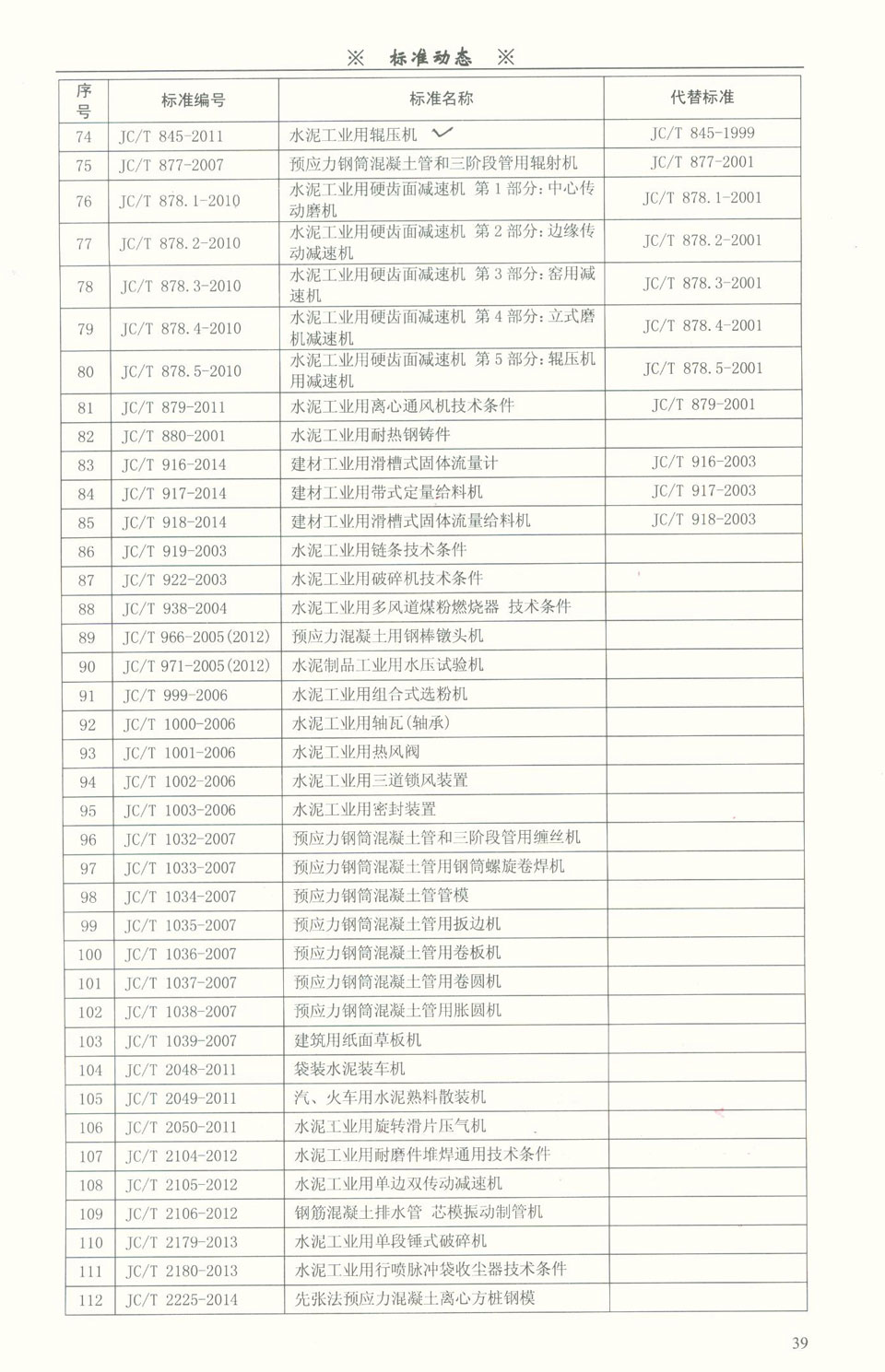 江蘇鵬飛集團著眼于國內(nèi)建材機械新技術(shù)、新產(chǎn)品、新工藝、新材料的技術(shù)領(lǐng)域,普及和提高標準化意識,強化新標準的宣貫工作,提高對標準化工作的感知、重視程度,全面提高行業(yè)各類標準的覆蓋率,創(chuàng)造更加良好的標準化工作發(fā)展空間。公司在企業(yè)內(nèi)部制定并實施了技術(shù)標準、管理標準和工作標準并有效組織推進實施,先后參與國家建材機械標準化技術(shù)委員會組織的GB/T27976-2011水泥工業(yè)管磨裝備、JC/T 333-2006 水泥工業(yè)用回轉(zhuǎn)窯、JC/T 334.1-2006水泥工業(yè)用管磨機、JC/T335-2006 水泥工業(yè)用回轉(zhuǎn)烘干機、JC/T 336-2014 水泥工業(yè)用推動篦式冷卻機、JC/T 402-2006 水泥機械涂漆防銹技術(shù)條件、JC/T 825.1-2001(2009) 水泥工業(yè)用自動控制預(yù)加水成球裝備 雙管螺旋喂料機、 JC/T 833-2011 水泥工業(yè)用堆取料機 技術(shù)條件 JC/T 842-1999 水泥工業(yè)用單筒冷卻機、JC/T 844-2007 水泥工業(yè)用立式輥磨機、JC/T845-2011水泥工業(yè)用輥壓機、JC/T401-2011建材機械用鑄鋼件技術(shù)條件、JC/T999-2006水泥工業(yè)用組合式選粉機、JC/T406-2006水泥機械包裝技術(shù)條件、JC/T405-2006水泥工業(yè)用增濕塔等15項產(chǎn)品標準起草工作.