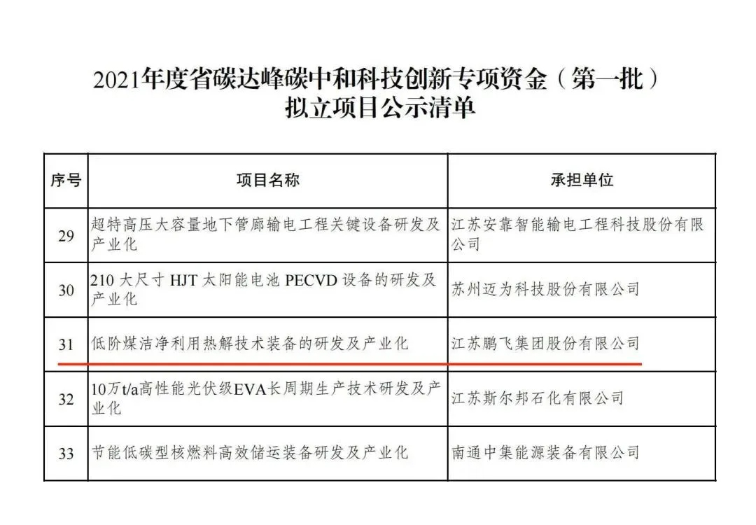 近日,江蘇省科技廳發(fā)布《2021年度省碳達峰碳中和科技創(chuàng)新專項資金(第一批)擬立項目公示》。座落于江蘇海安的鵬飛集團股份有限公司的“低階煤潔凈利用熱解技術裝備的研發(fā)及產業(yè)化”項目獲立項公示。利用回轉窯熱解技術進行低階煤提質清潔利用屬國內首創(chuàng),項目已獲授權發(fā)明ZL10件、實用新型ZL9件。