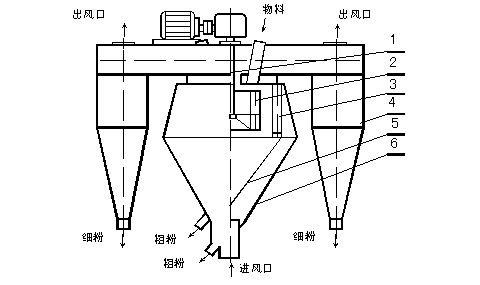 由傳動(dòng)裝置、回轉(zhuǎn)部分(主軸、撒料盤、轉(zhuǎn)子等),機(jī)殼(內(nèi)筒、導(dǎo)向葉片、內(nèi)錐體、外筒、外錐體、進(jìn)風(fēng)口、加料口、兩個(gè)粗粉出口等),細(xì)粉收集裝置(四個(gè)旋風(fēng)筒等)組成。