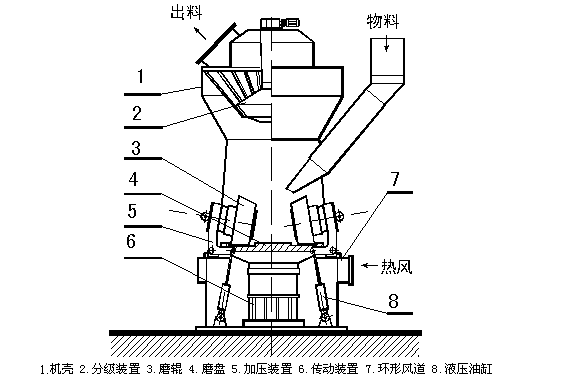 2.氣體流程:熱風(fēng)→立式磨→旋風(fēng)收塵器→1號(hào)排風(fēng)機(jī)→袋收塵器→2號(hào)排風(fēng)機(jī)→排空。 循環(huán)風(fēng)(余熱利用)
