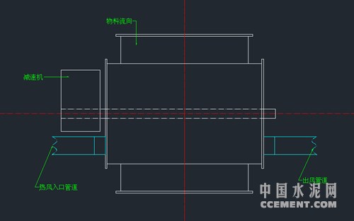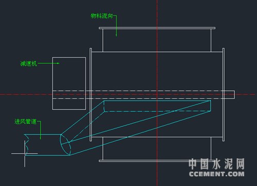 方案二:在鎖風閥軸向位置安裝導風管,將窯尾熱風通入鎖風閥,增加內(nèi)部溫度,防止粘料,后從另一側通入磨機中,由于本公司安裝空間有限,以及成本等因素考慮,后分析認為這種方法并不適用與本公司。(如圖一)
