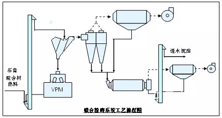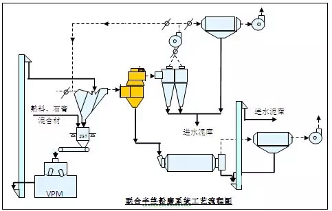 此工藝運用于VPM立磨功率與球磨機功率比值大于0.5的場合,該系統主要優(yōu)點是系統產量高(增產100%以上),單位電耗低。