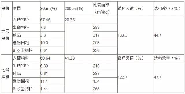 2、同時對六七號磨機(jī)的入磨物料、出磨物料、選粉機(jī)回粗、B收塵的物料、水泥成品、在磨機(jī)運(yùn)轉(zhuǎn)正常的情況下進(jìn)行取樣,做80um、200um、及比表面積以計算磨機(jī)的循環(huán)負(fù)荷和選粉機(jī)的選粉效率。測量結(jié)果見下表: