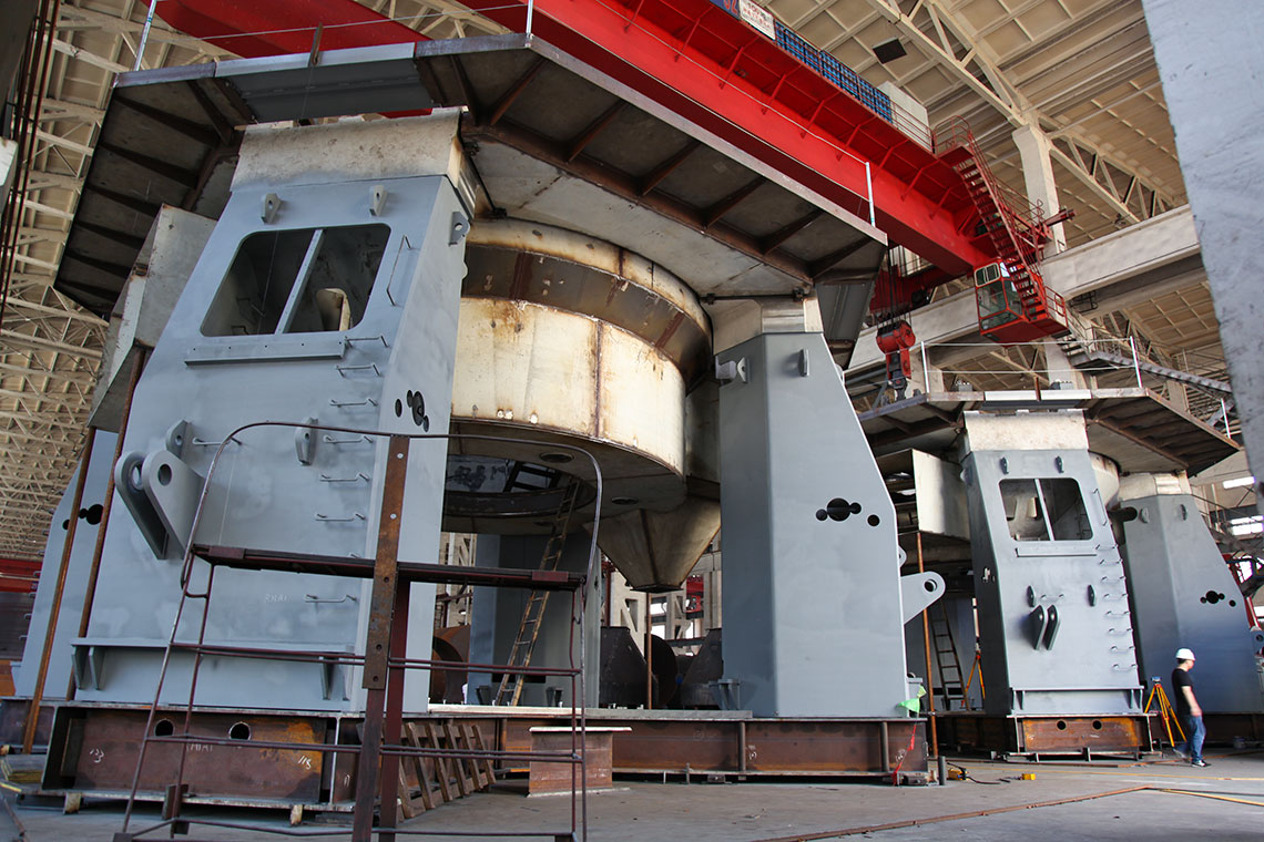 磨煤機三個磨輥由旋轉(zhuǎn)的磨盤帶動進行碾磨作業(yè)。入磨物料經(jīng)中心落煤管落在磨盤上后,由旋轉(zhuǎn)磨盤產(chǎn)生的離心力將其輸送至碾磨輥道上碾磨。碾磨壓力由彈簧或液壓加壓裝置產(chǎn)生,通過靜定的三點系統(tǒng),碾磨力均勻地傳至三個磨輥,通過加壓系統(tǒng)壓力傳至基礎(chǔ)。煤粉的干燥和輸送利用熱風(fēng)來進行。熱風(fēng)通過噴嘴環(huán)均勻分布于磨盤四周,將經(jīng)碾磨的物料干燥并輸送至磨機上部的分離器。物料的粗細粉在此分離,細粉排出磨機,粗粉重新返回磨內(nèi)碾磨。物料中的一些不可破碎物可通過磨機下部的排碴口排出。磨煤機主要由基礎(chǔ)部,減速機,下架機,中架機,磨盤,磨輥,加壓裝置,分離器,正壓風(fēng)密封裝置,蒸汽吹掃裝置等部件組成,還配有主電動機,潤滑油站,液壓站和密封風(fēng)機等附屬設(shè)備,另備有慢速傳動裝置,安裝檢修專用工具,扶梯平臺,煤粉分配器,速斷閥等配套設(shè)備供用戶選用。磨煤機采用液壓加壓系統(tǒng),在運行中即可對粉磨壓力進行調(diào)整,并具有更好的過鐵保護性能。在原標準型的基礎(chǔ)上增加了磨輥翻出裝置,并提高了磨體的抗爆能力。